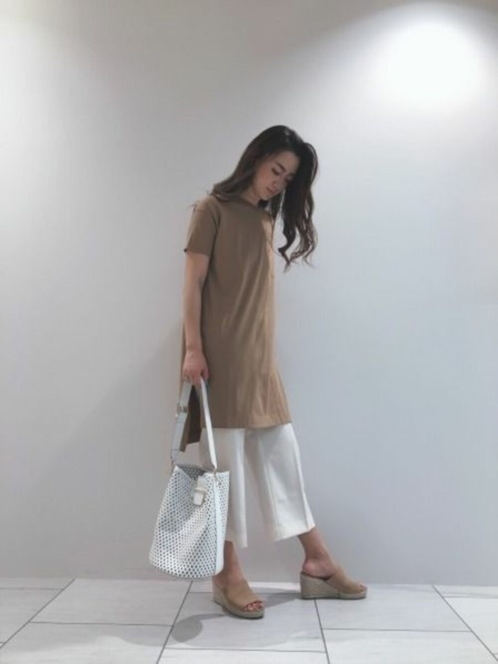 ベージュ×ホワイトのコーデでシンプルでも女性らしい印象に。