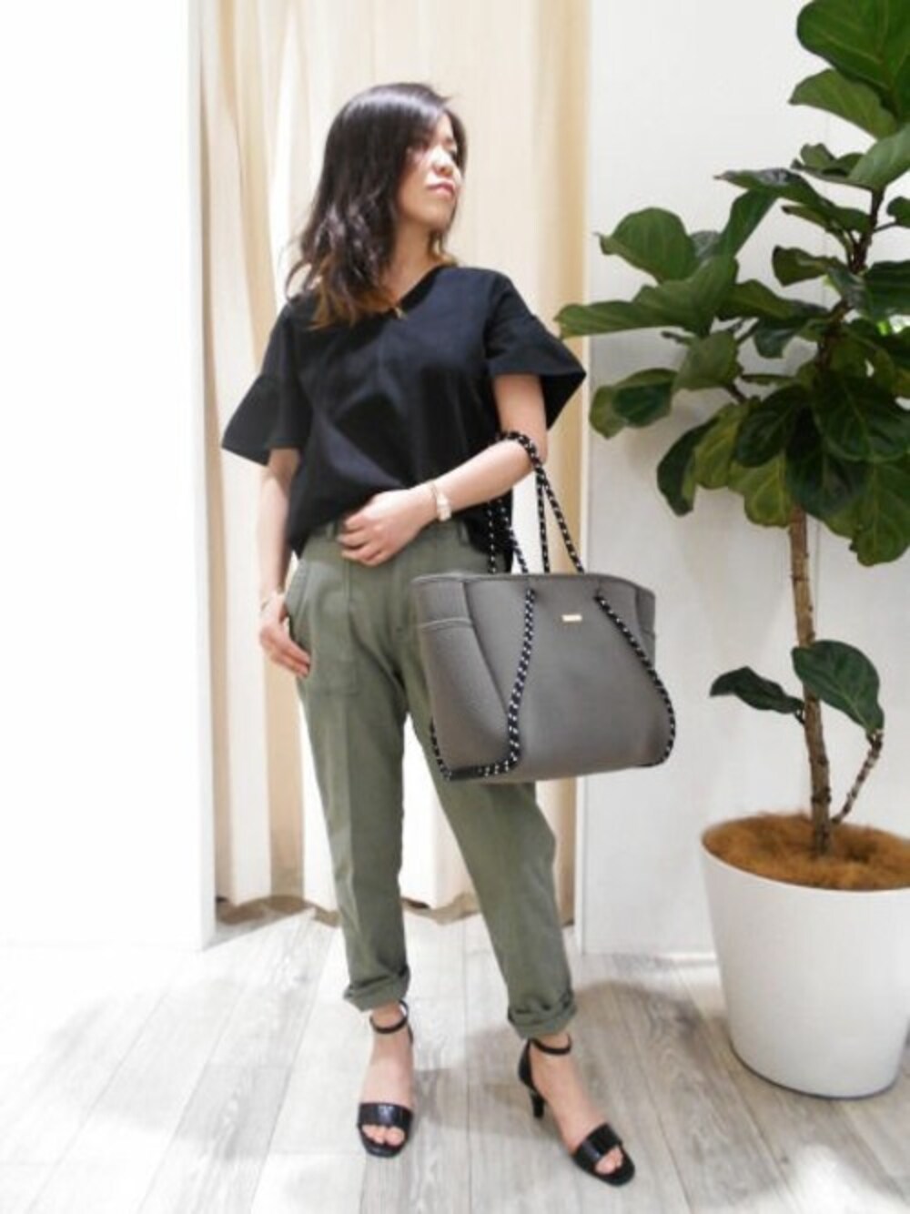 フリルがポイントで飽きのこないデザインのトップスは着回しがきいて 便利です。 オリジナルのバッグも軽くて使いやすくおすすめです♪