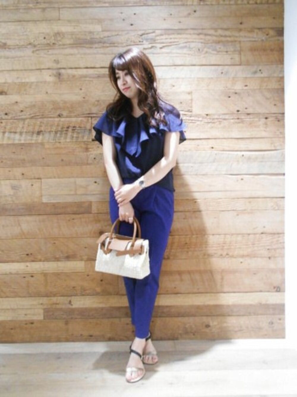 ブルーのグラーデーションコーデです。 キャメルとの相性も○です。 リネン混のブラウスはフリルがポイントになるので 1枚で決まります。