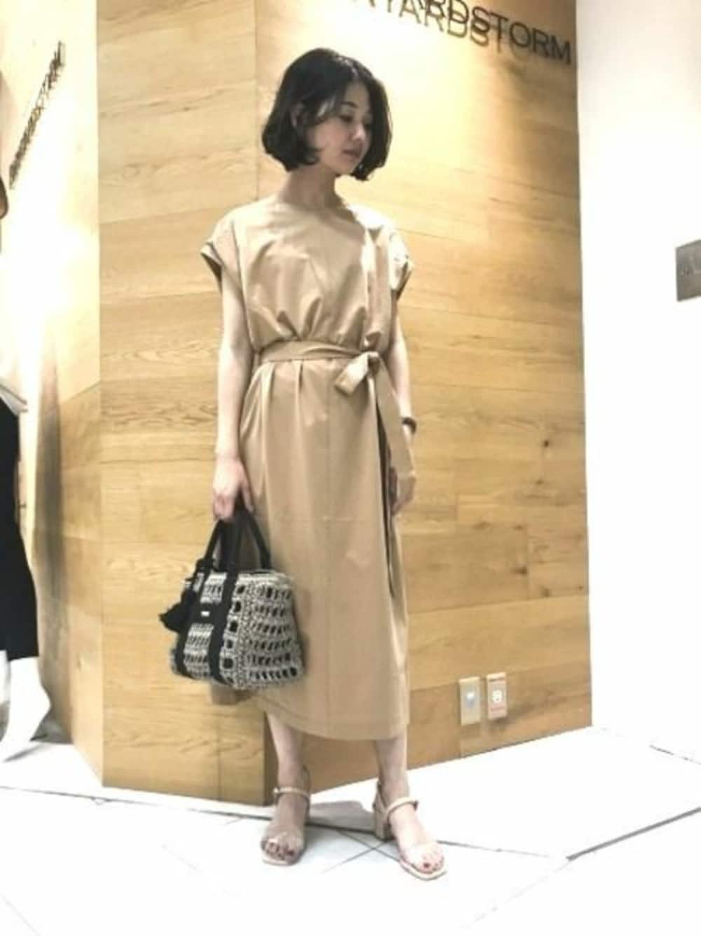 シンプルなワンピースはベージュでまとめると今年らしい雰囲気に。 パンツを下に履いても○