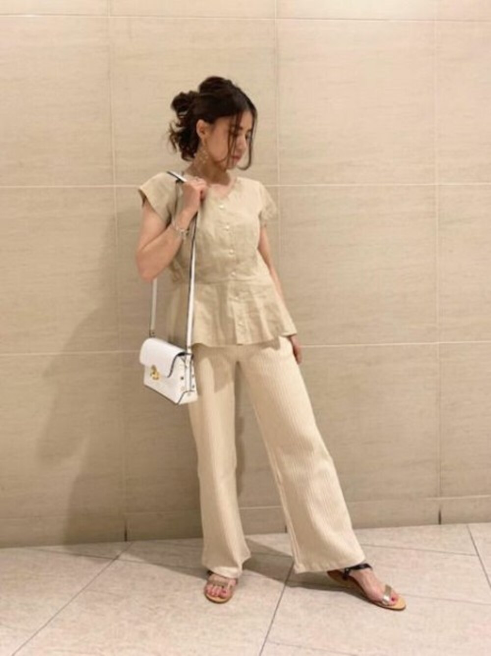 ベージュでまとめると女性らしい雰囲気に。 リネンのブラウスはペプラムで形が綺麗です♪