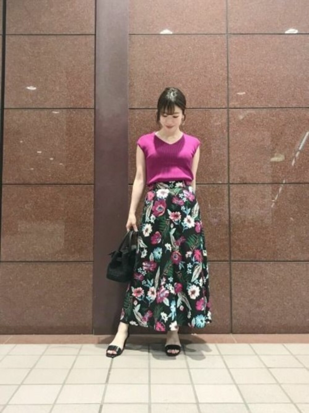 バンヤードオリジナルのボタニカルフラワーのスカート! 程よいフィット感のリブニットと合わせたキレイめコーデです♪