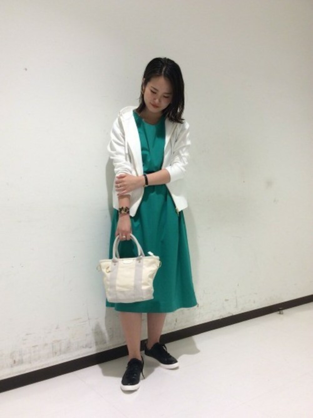 ロングワンピースは1枚で着ても、 パンツを重ねてロングTシャツの様に着るのも今年っぽい着こなしになります。 グリーンは明るく存在感のある1枚です。