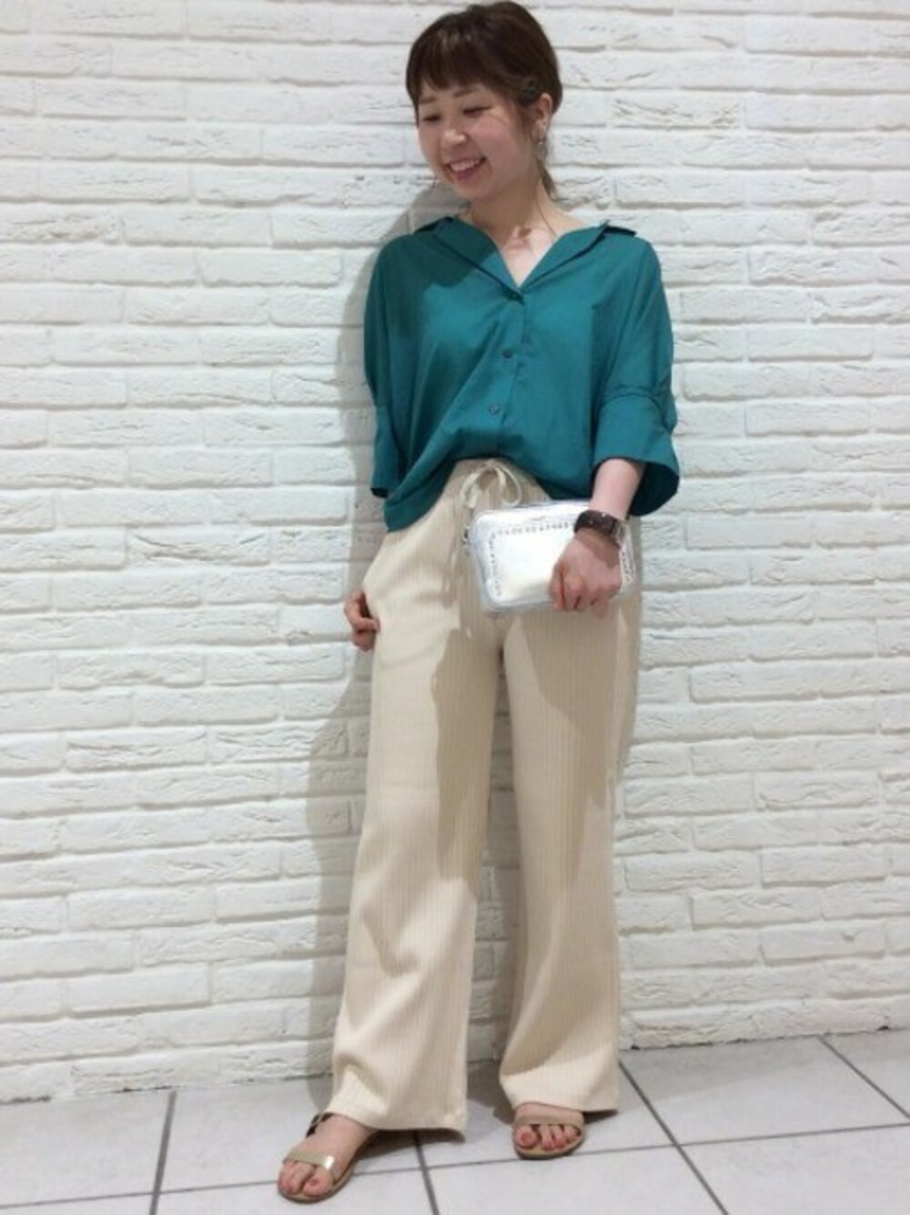 軽い素材感のシャツはエリ抜きで 女性らしく着るのがオススメです