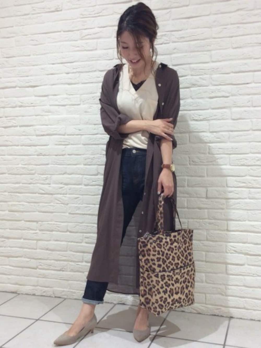 ブラウンとベージュで落ち着きのあるコーデです。 シャツは透け感があり羽織りやすく女性らしく◎