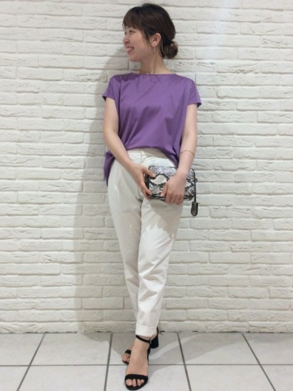 光沢感が綺麗なTシャツは後ろにタックがあり 女性らしいシルエットで着ていただけます。