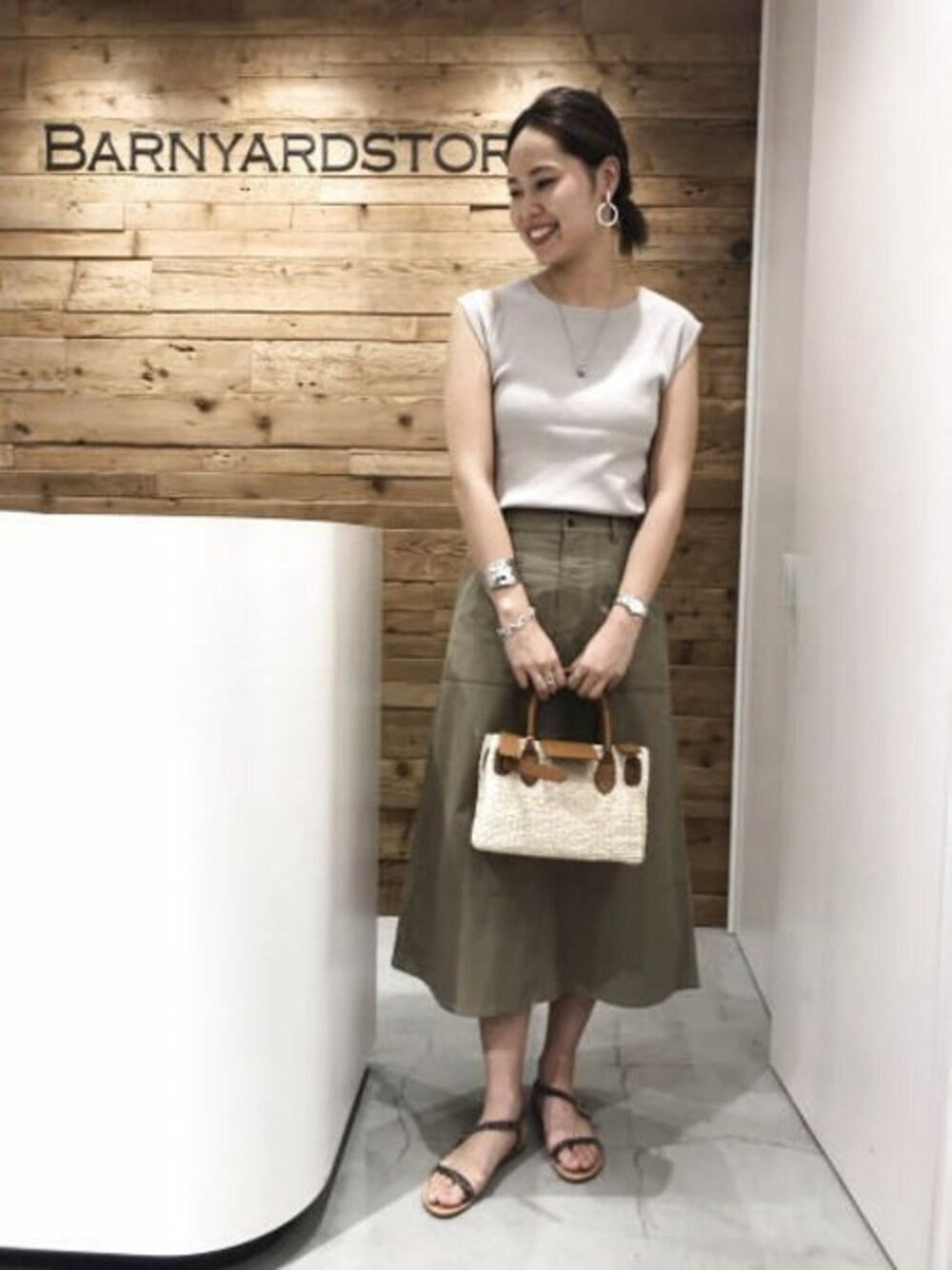ミリタリーのスカートはトップスを選ばずに合わせやすいです。 肩にスリットの入ったニットは女性らしいシルエットがポイント。