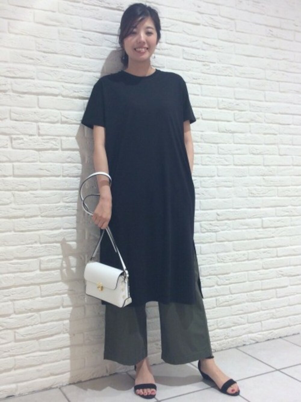 カーキのワイドパンツはハリ感があるので ロングで合わせてもすっきりした印象に。