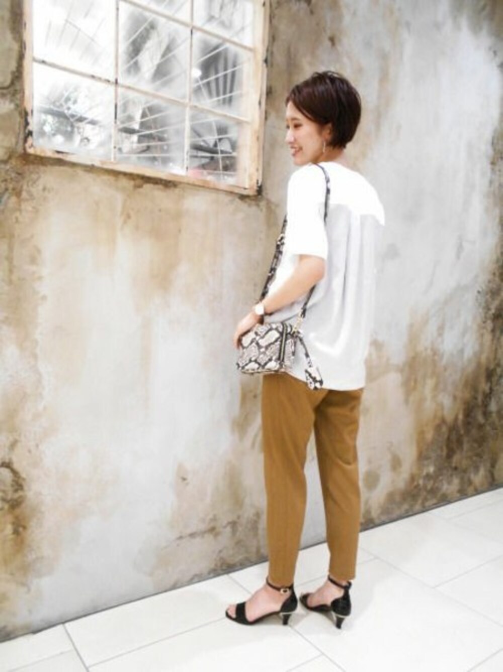 シンプルコーデもパイソン柄の小物を入れると 地味にならずおしゃれ見えします。