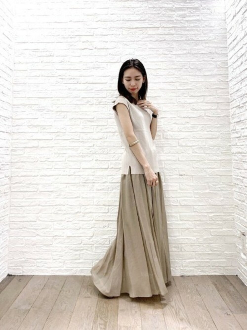 ベージュコーデで涼しくて女性らしい雰囲気になります。 スカートはキレイメな素材感。