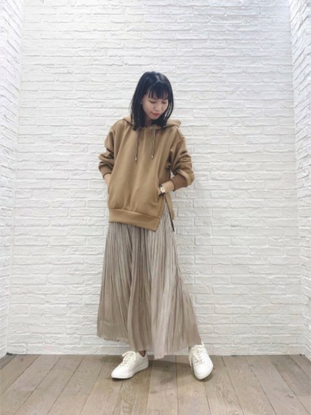ZIPがスリットになるパーカーは これからアウターとの重ね着にも活躍。 プリーツスカートはすべりも良くレイヤードスタイルにも便利なアイテム。