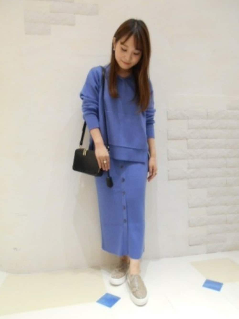 ニットのセットアップのブルーは 明るいカラーでこれからアウターを羽織っても 暗い印象にならずおすすめ。 ばらばらでも着回せて柔らかく着心地も○