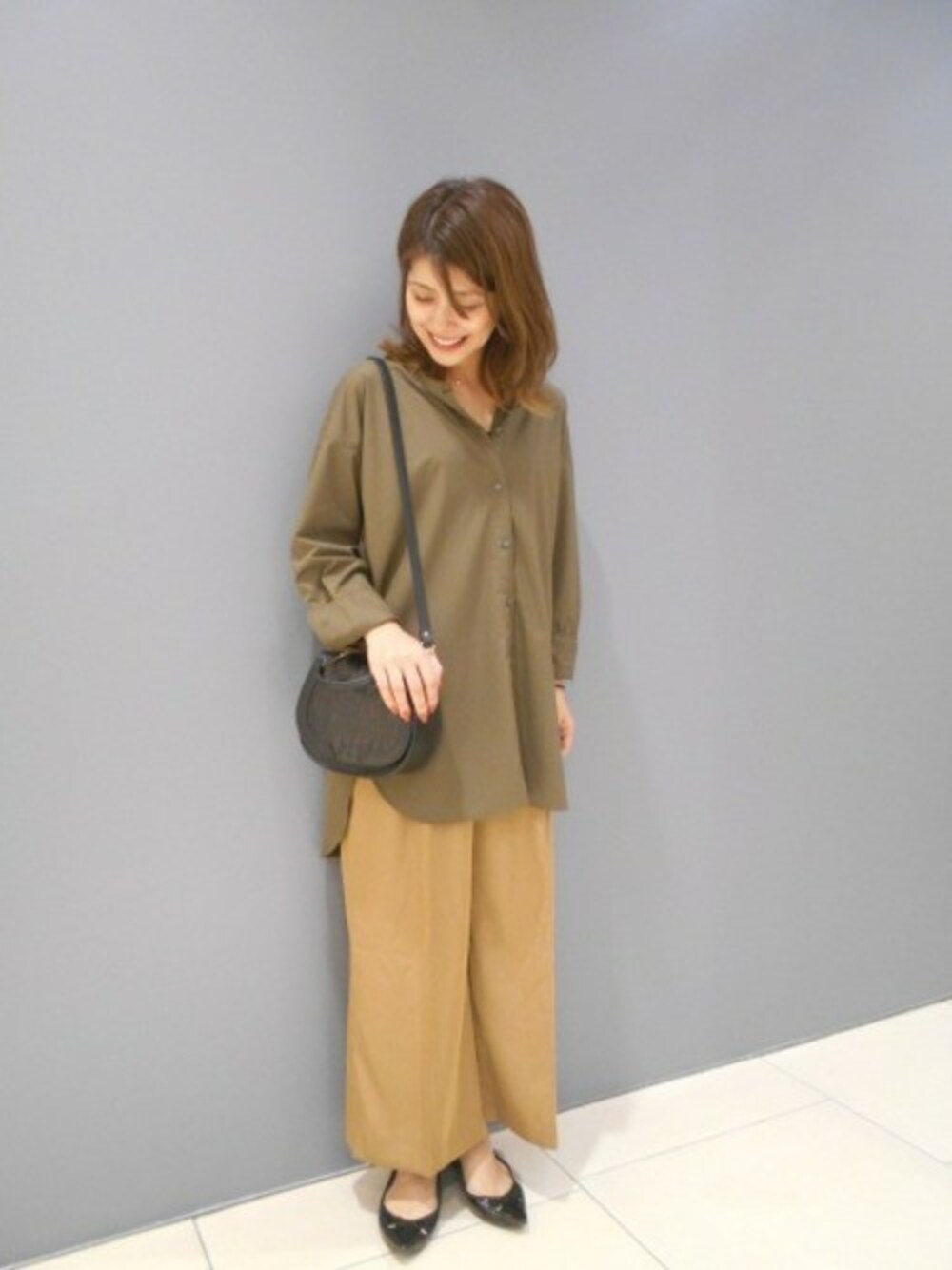 さらっとしてシワになりにくいカーキのシャツは レイヤードもしやすく、 後ろのボタンでシルエットを細く出来ます。