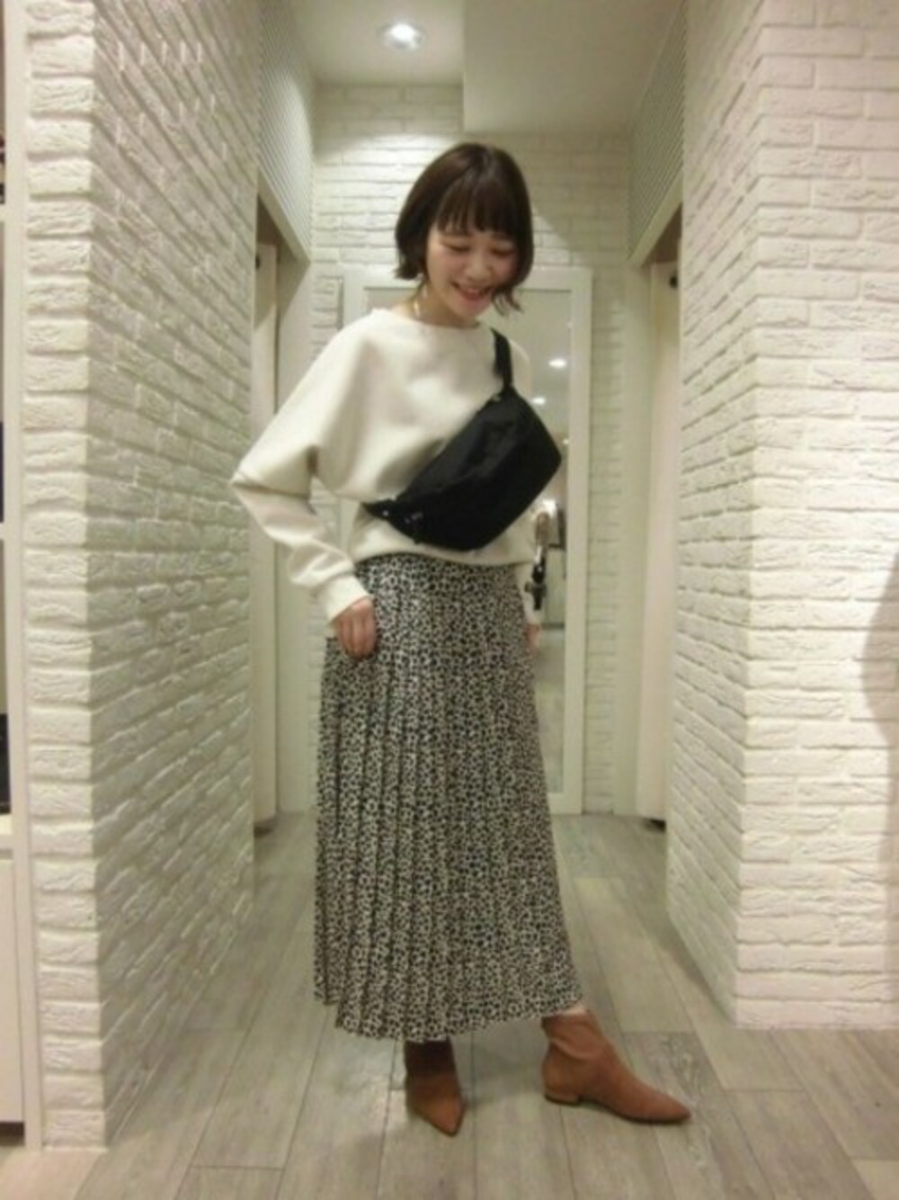 レオパードのスカートはプリーツで上品さもあり、 大人が履けるレオパード柄です。 ニットの様なカットソーはニットが苦手な方にもおすすめ。