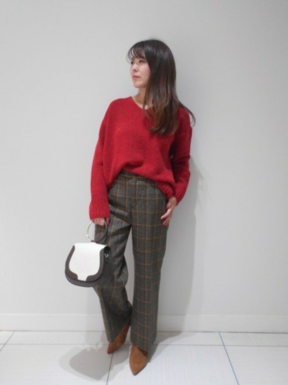 赤いニットとチェックのパンツで 季節感のあるコーデです。