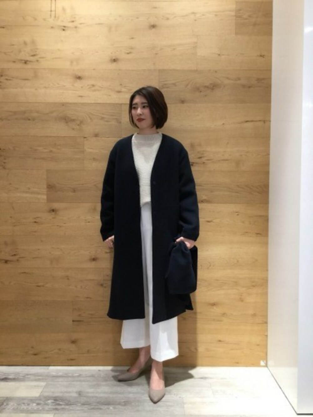 ノーカラーのコートはストールがセットです。 同素材で付けるとこなれた雰囲気に。