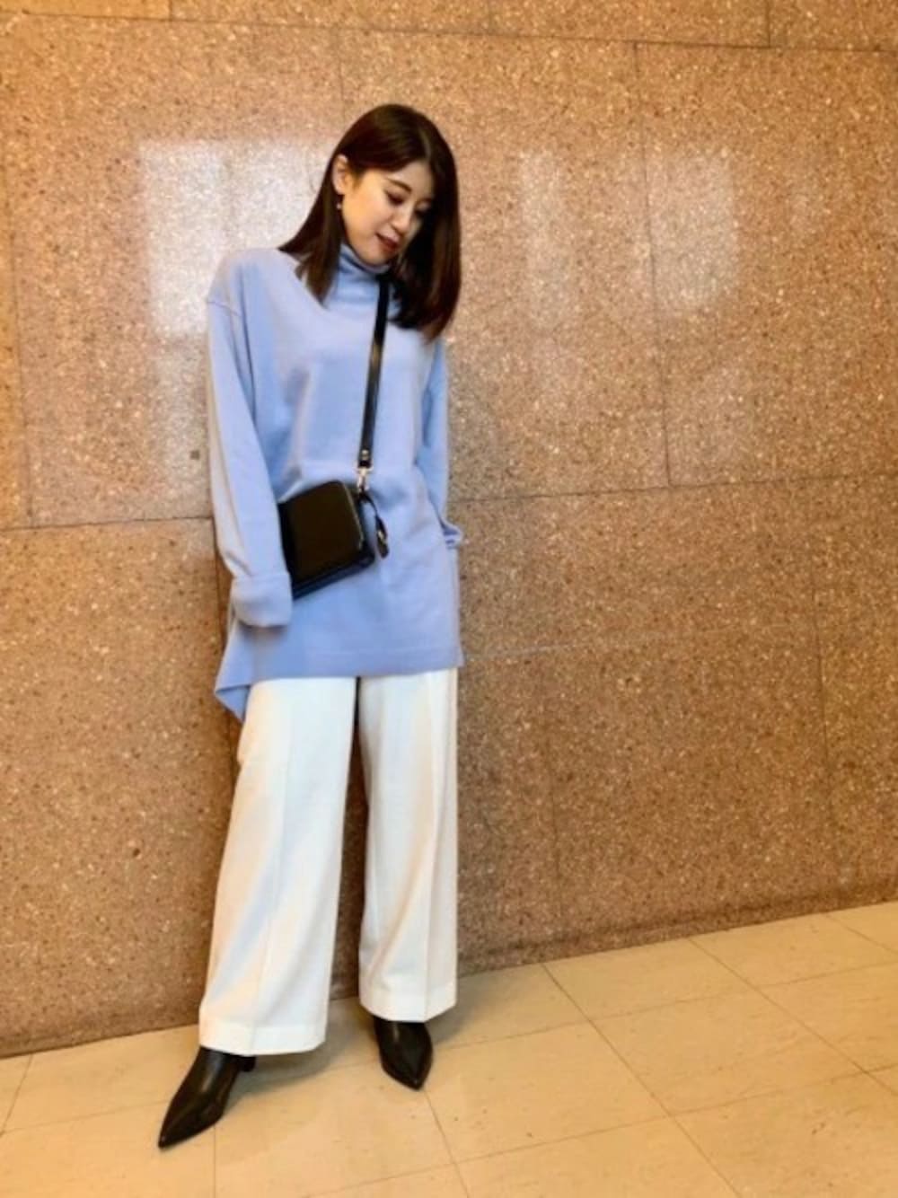 ブルーとホワイトで爽やかなコーデです。 ニットは長めですがスッキリ見えるシルエット。