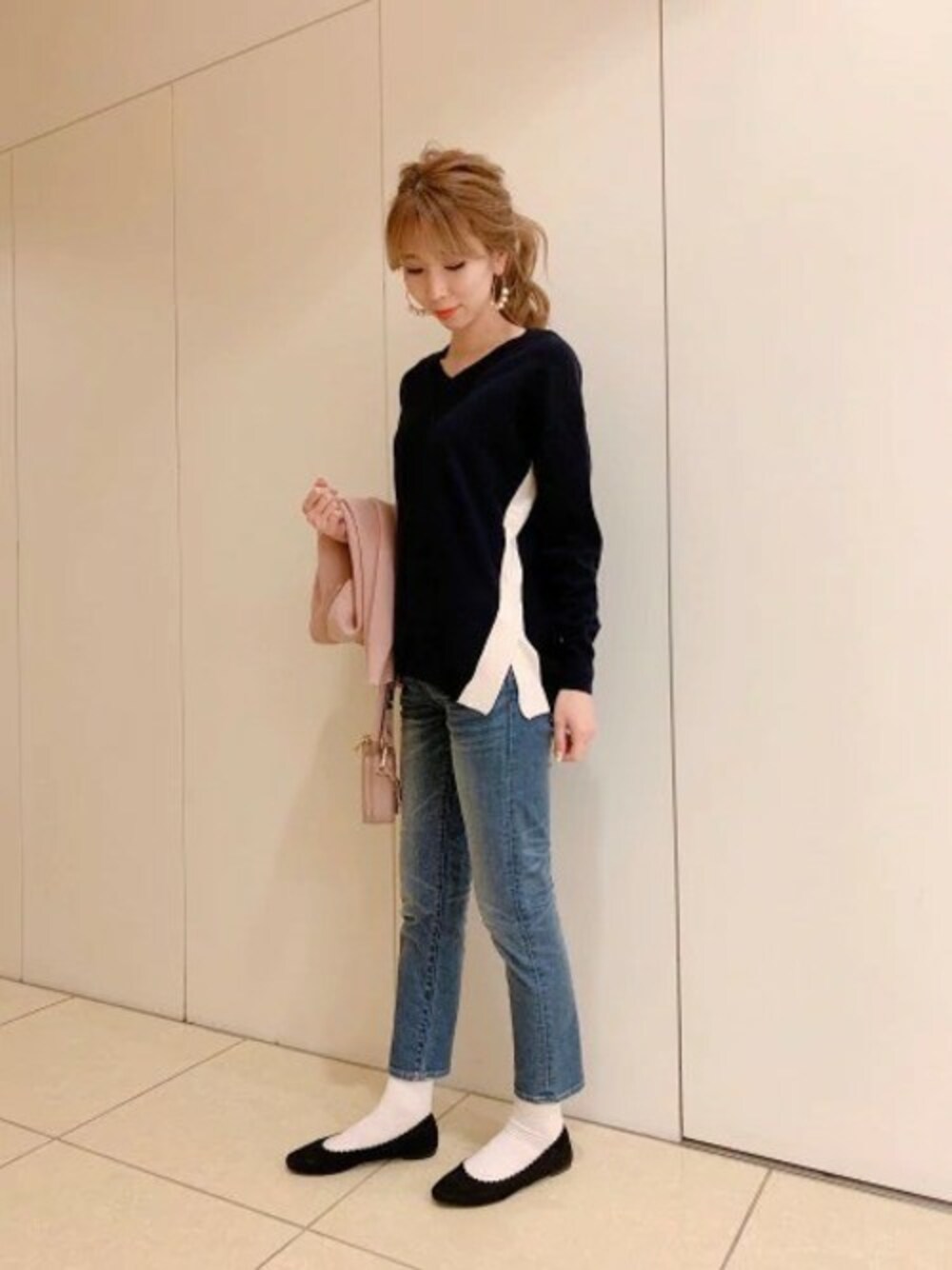 サイドの配色が効いたニットは1枚で決まるアイテム。 ピンクの小物を合わせるとグッと春の雰囲気に。