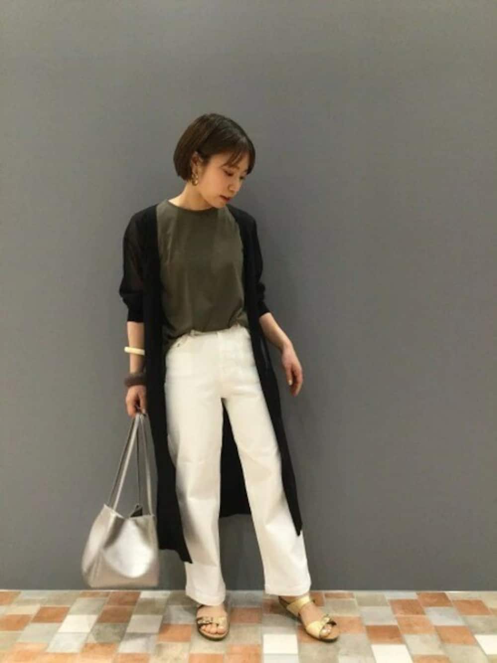タンクトップとシアーのカーディガンで 温度調節の出来るきれいめコーデです。