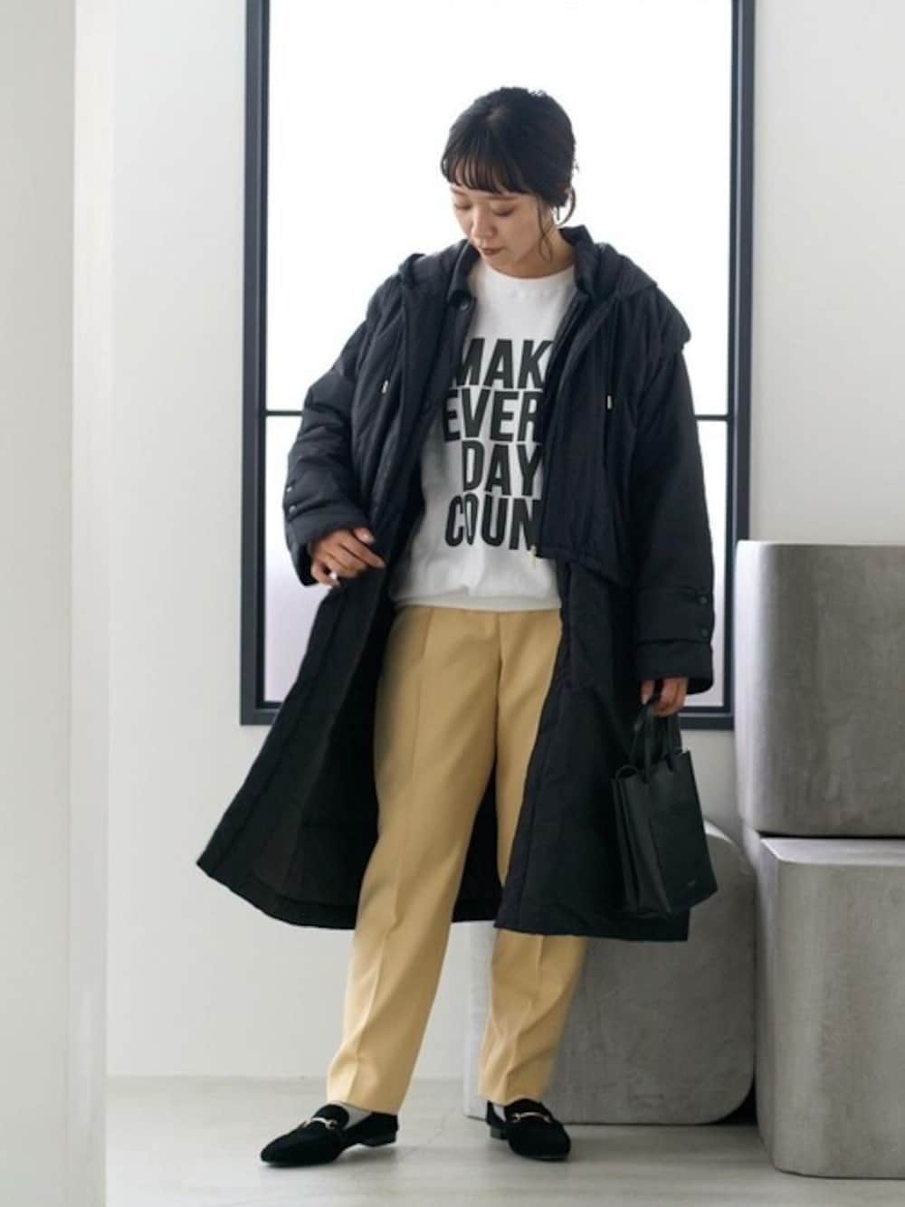 【styling】 着回ししやすいアウターです! たっぷりサイズで今時期から取り入れやすく、日常使いしやすいデザイン。 パンツは緩めのテーパード。 ボディライン拾わず着用できます!