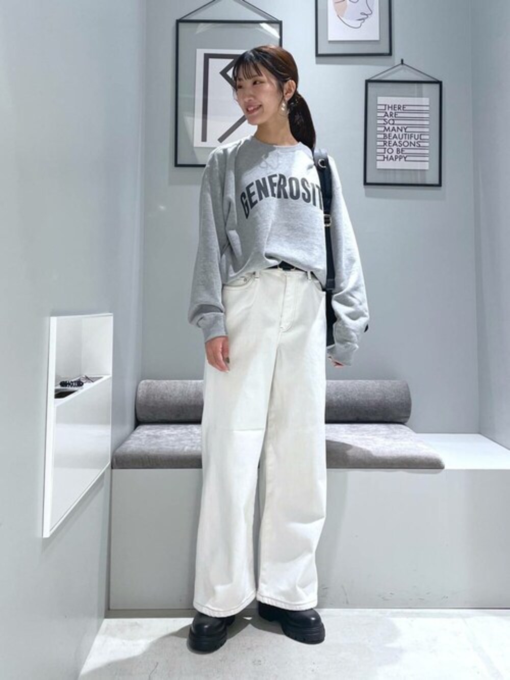 【トップス】 GENEROSITYスウェット / M(1) 秋から春まで活躍するロゴスウェット! 裏毛なので暖かくて今の時期だと1枚で。 寒くなってくると薄手のタートルやシャツと合わせて着ると可愛いです✌️ メンズライクなサイズ感なので、ボトムはチュールスカートなどと合わせて女っぽさ取り入れるスタイリングもおすすめ🤤 【ボトム】 裏起毛ワイドデニムパンツ / M(1) 毎年大人気ですぐなくなってしまう裏起毛デニムからワイドタイプが出ました😮 裏がふわふわのフリースのような感じで、肌触りも滑らかでとっても暖かいです🥺 持つと重ためですが、履いている分には私は気にならなかったです!! シルエットも綺麗にすとんと落ちる形で膨れて見えたりしないです✨ ウエスト後ろはゴムになっていて楽ちんです🫧 冬には絶対マストの裏起毛デニムです👀