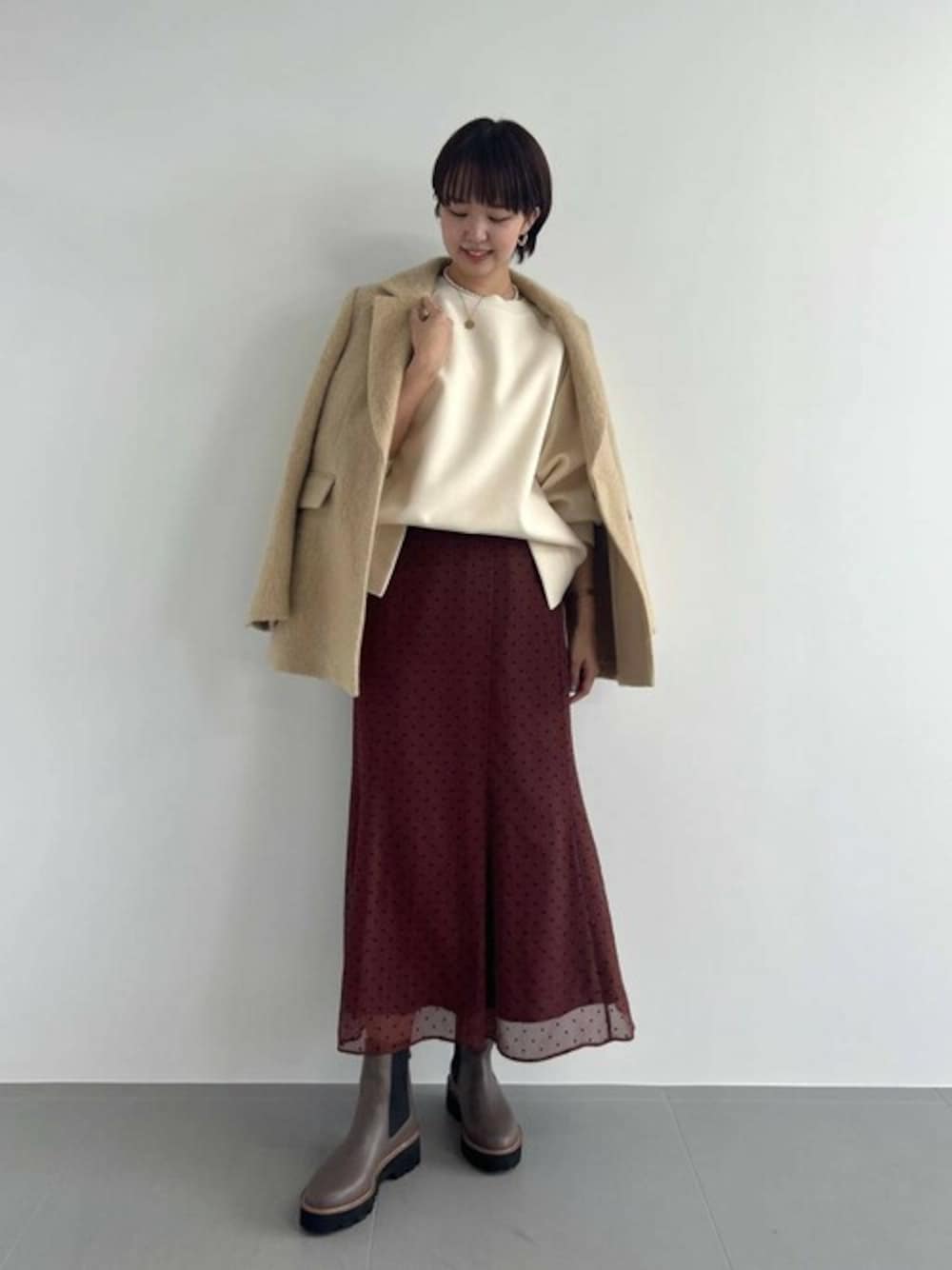 ●アウター ジャケットのようなデザイン ベージュカラーが優しい印象 ●トップス 去年も大人気だったプルオーバー ニットとトレーナーの間の感覚で着れます! ●スカート すこし透け感のあるお素材がかわいいです 体のラインは拾わないけど、 すらっと見えるシルエット◎