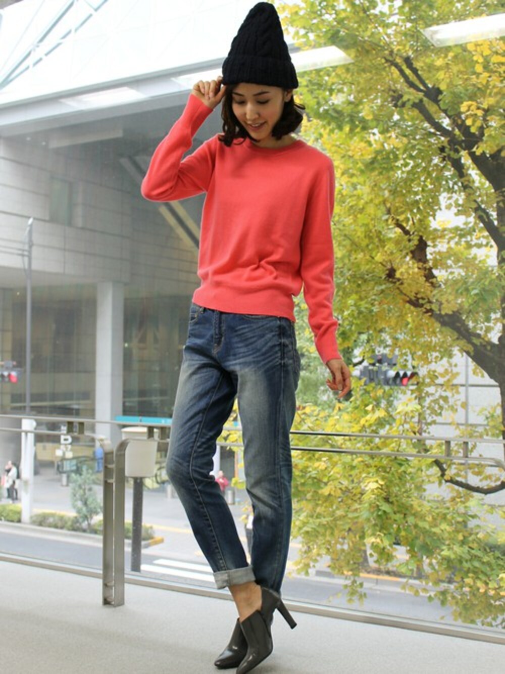 ピンクのカシミヤニットとテーパードデニムのシンプルコーデ★