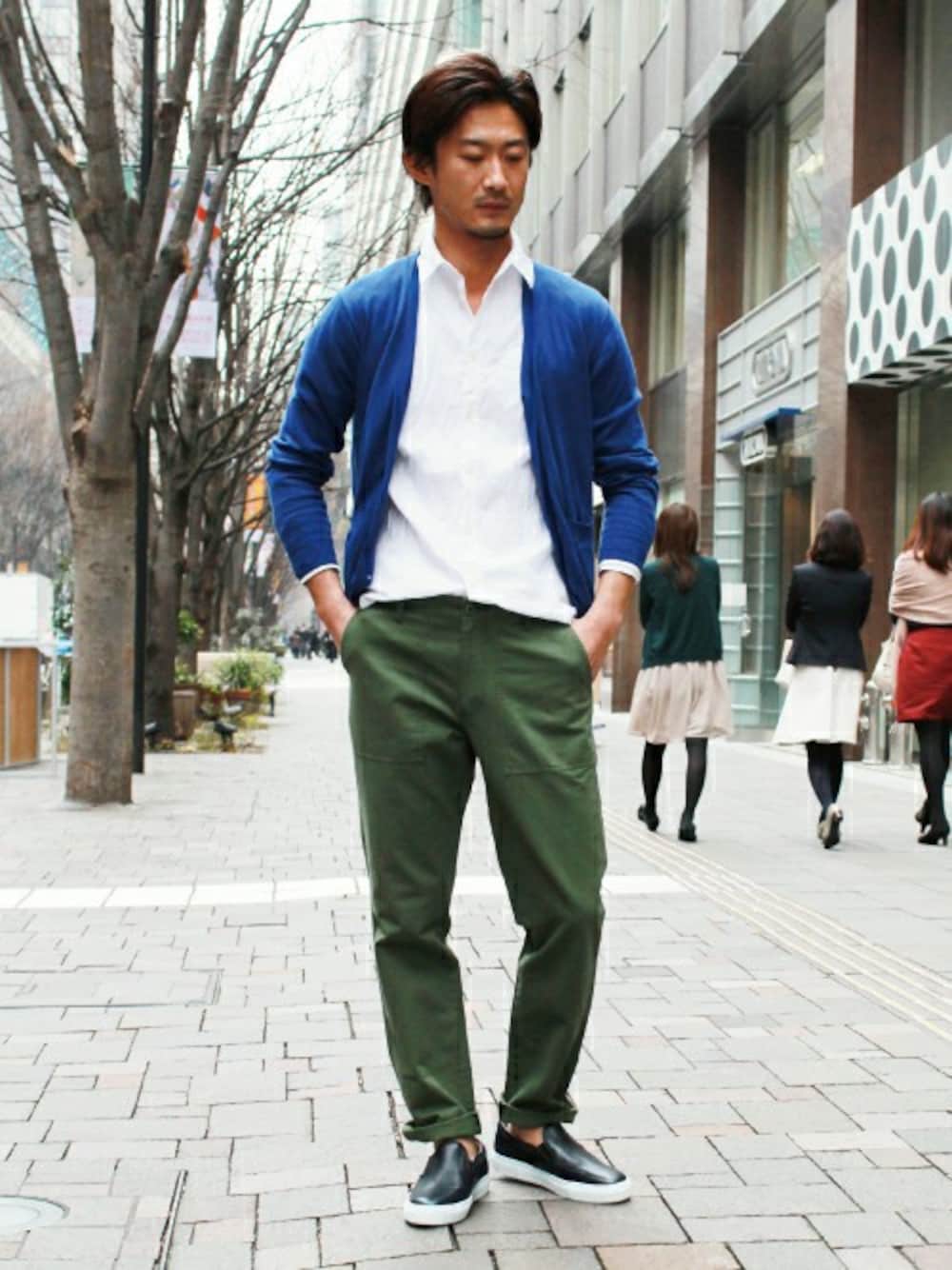 今季トレンドのミリタリーテイストのパンツに春らしい鮮やかなカラーリングのカーディガンを合わせました。ブルーがポイントです。