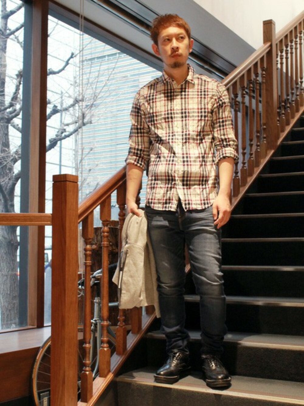 カジュアルなチェックシャツにデニムを合わせた休日スタイリング。