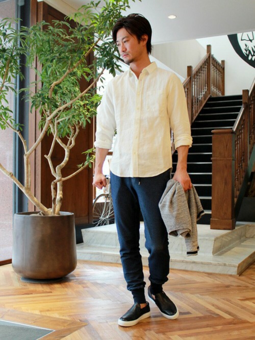 デニムのイージーパンツにリネンシャツを合わせた休日スタイリング。 ストレッチの効いたデニムは履き心地抜群。 休日におすすめパンツです。