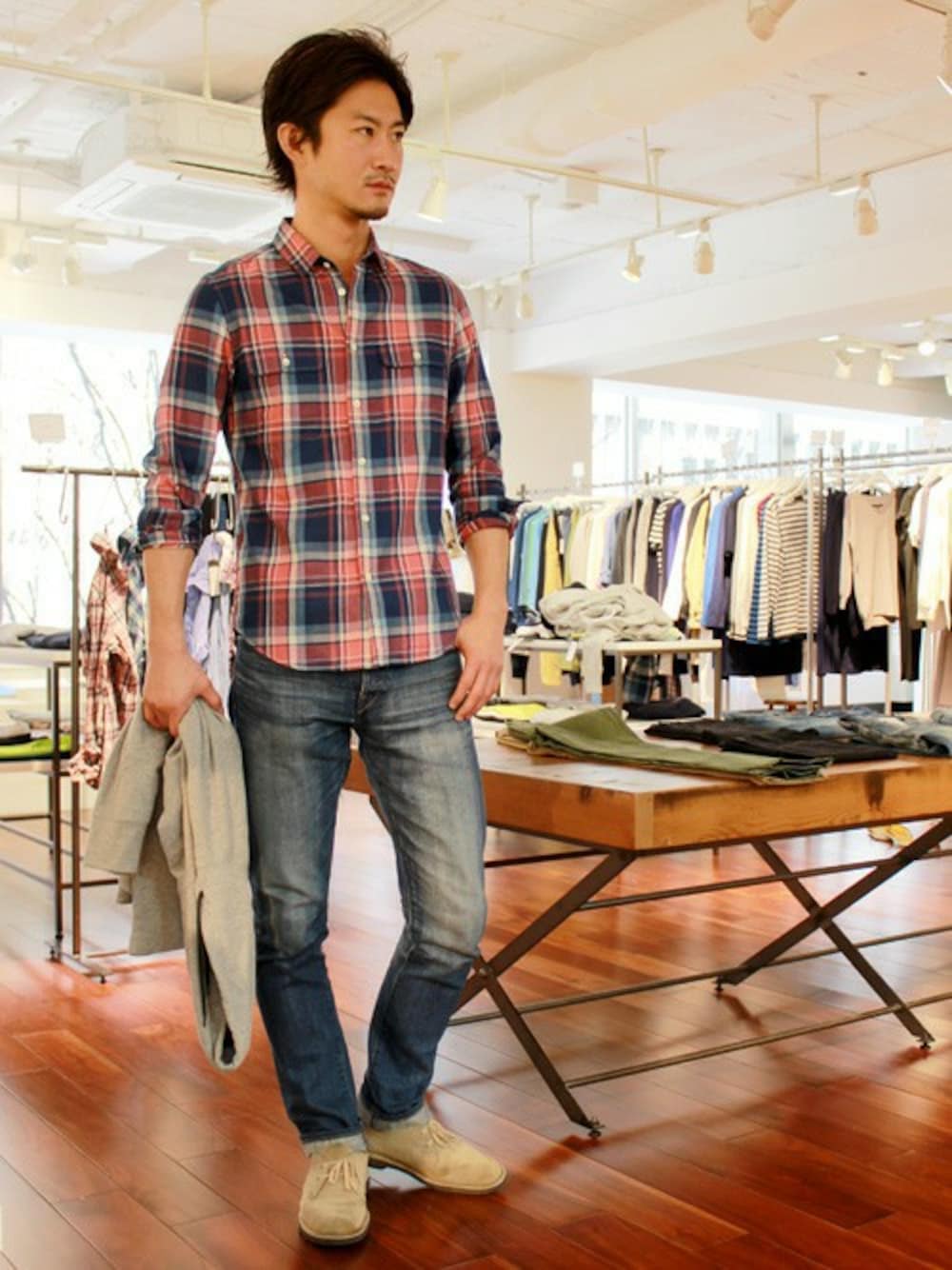 チェックシャツにデニムを合わせた休日カジュアルコーディネート。