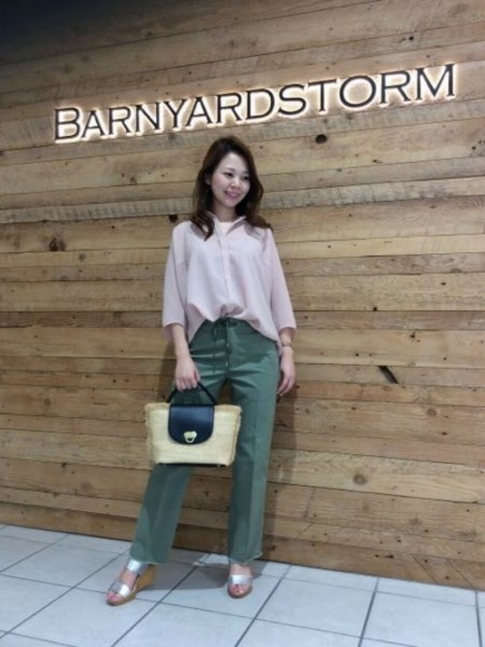 ゆったりしたシルエットのトロミシャツにストレートのチノパンで合わせ、ピンクとカーキ色の春らしいコーディネート。