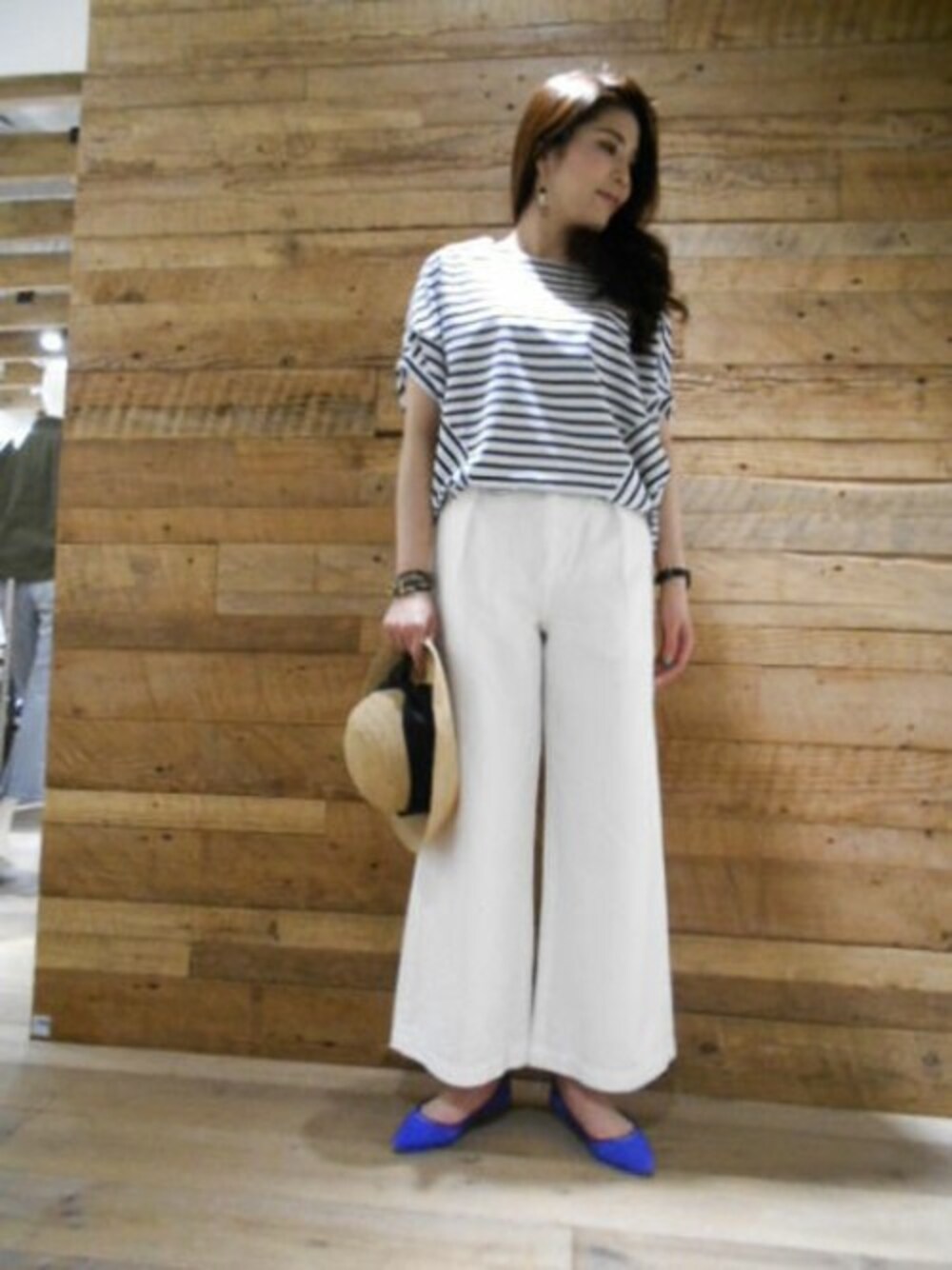 ボーダーTシャツ×ホワイトのワイドデニムのマリンテイストのスタイリング。 ビビットなブルーのバレエシューズがアクセントに☆