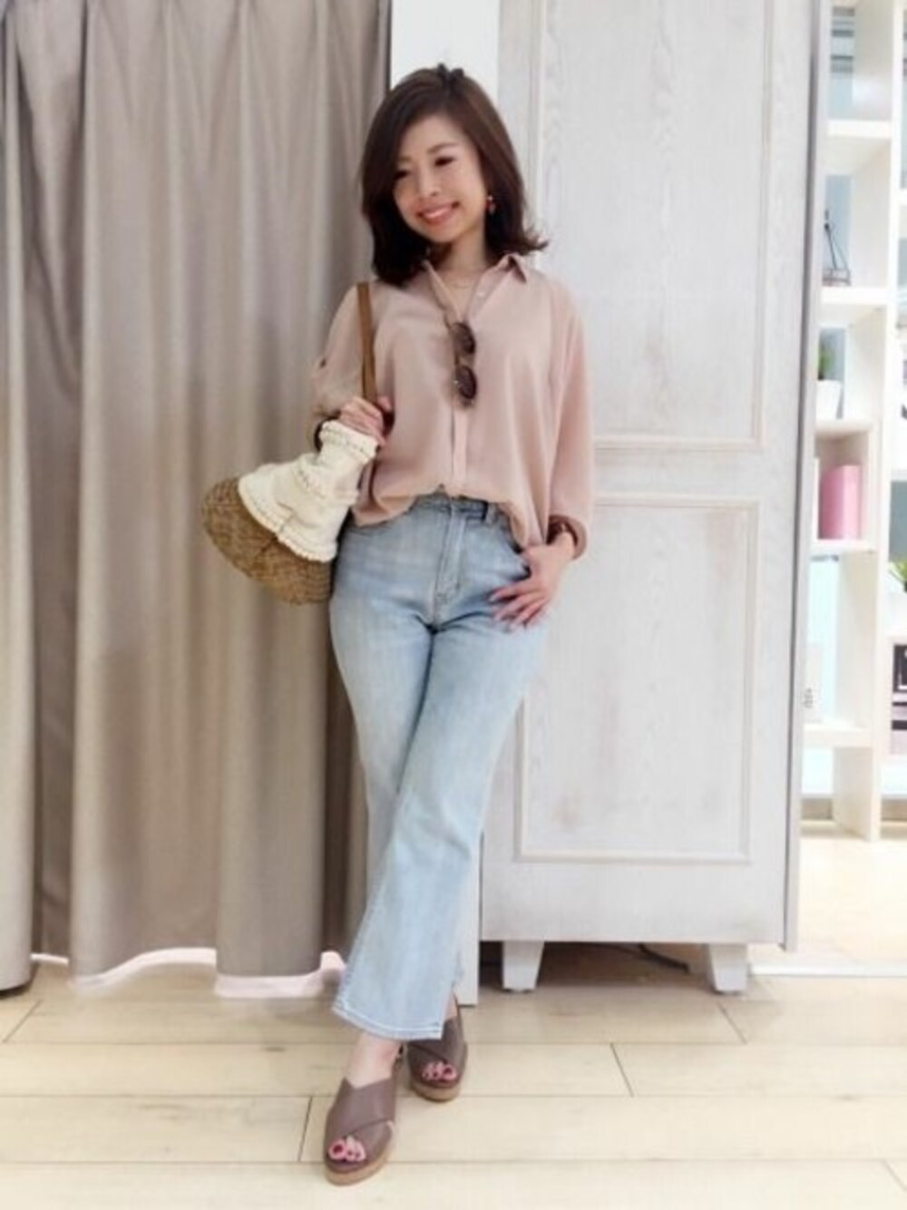 トレンドのフレアデニムにトロミシャツを合わせた大人カジュアルコーディネート☆ 小物で夏を演出!