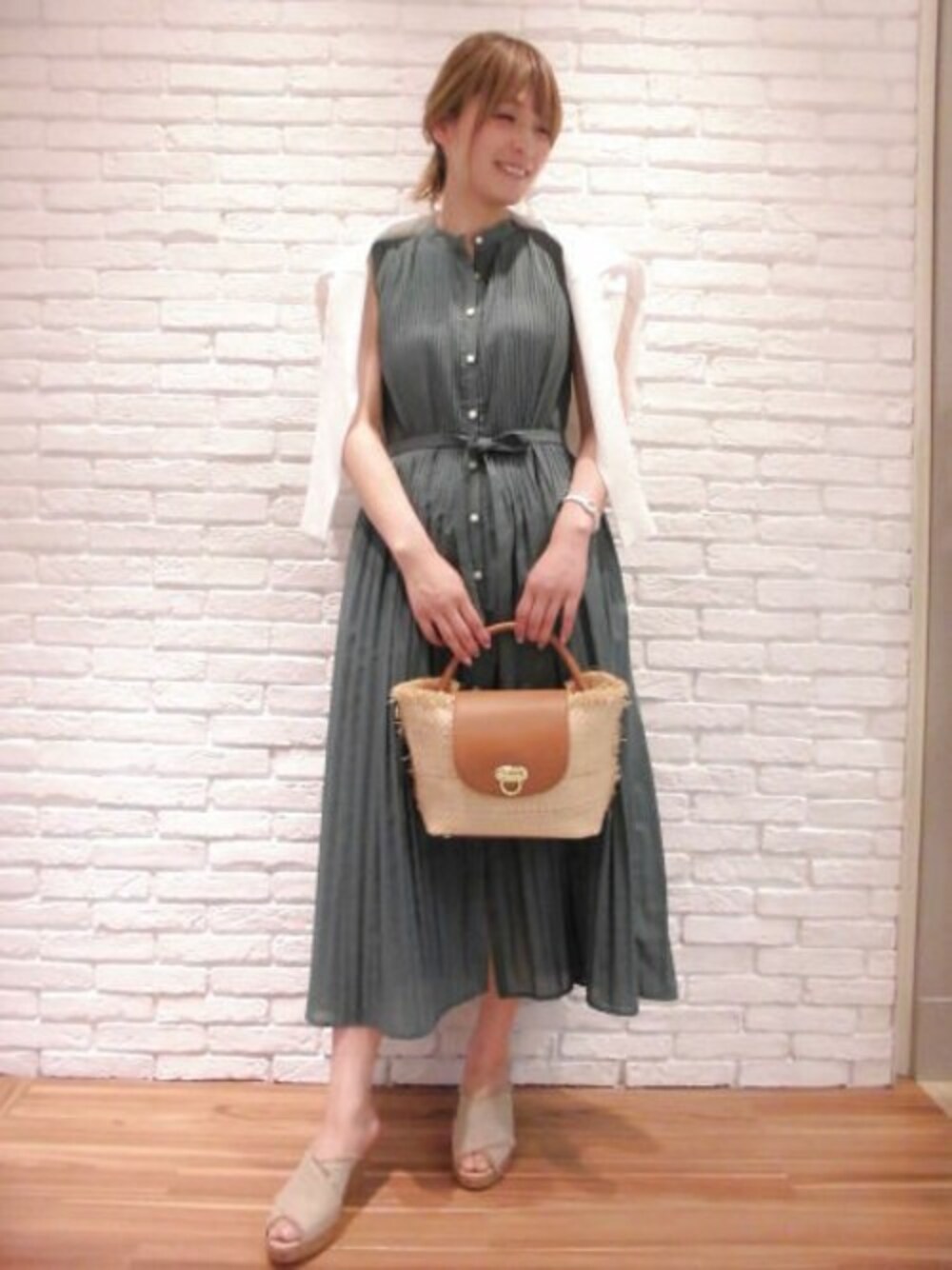 全面にプリーツをかけたワンピースは、綿タッチにこだわったポリエステル素材なのでさらっと軽く着ていただけます。 程よく透け感もあって涼しげです。 ペチコート付きワンピースですが、ボタンをあけて羽織ることもできます♪