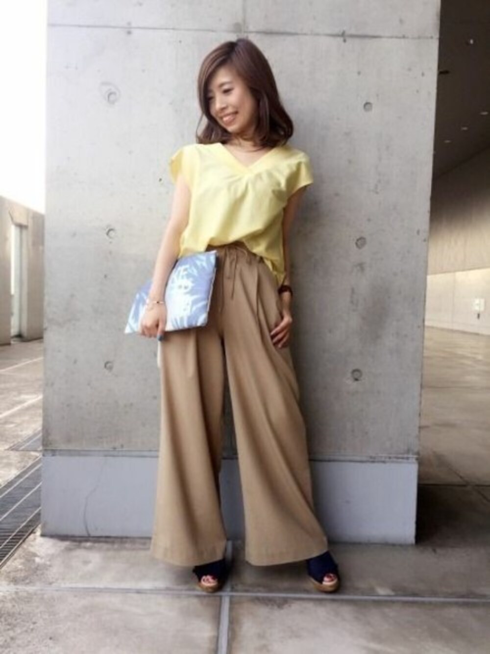 夏の大人スタイル。 Tシャツと合わせるのではなくブラウス見えするカットソートップスを 使うだけで大人の夏スタイルの完成。 ベージュのワイドパンツと合わせることで上品な印象に。