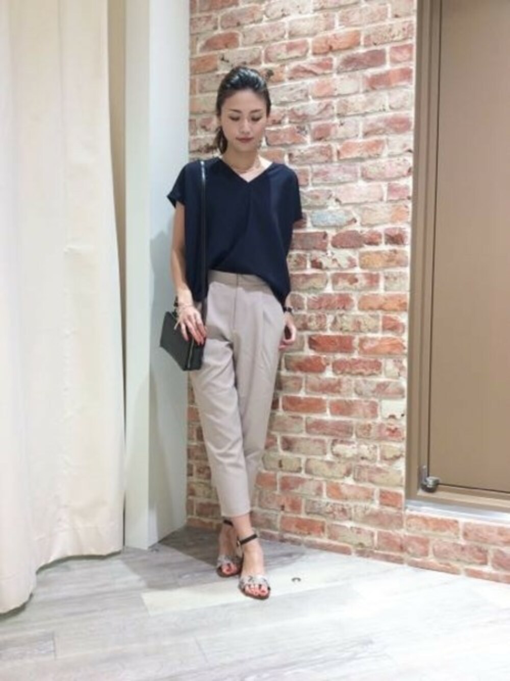 モノトーンスタイル。 きれいめ素材を使ったパンツなので、より上品に合わせるなら同素材のブラウスを。 Tシャツと合わせてデイリーカジュアルにもお使いいただきます。
