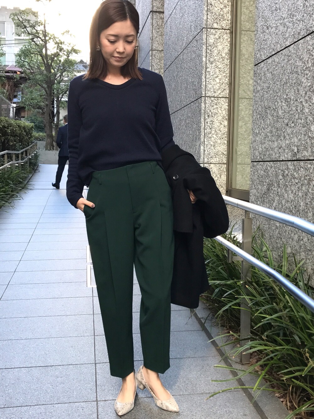 ハンサムスタイル きれいめテーパードパンツはグリーンをセレクト。 深みのあるグリーンなので、シンプルにまとめるだけでこなれ感ある雰囲気に仕上がります。