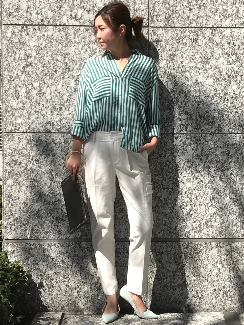 ストライプシャツに白のパンツを合わせた爽やかなハンサムスタイルです。 ボーイズライクになりがちなカーゴパンツも素材とシルエットで大人の女性が着こなしやすいパンツになります。