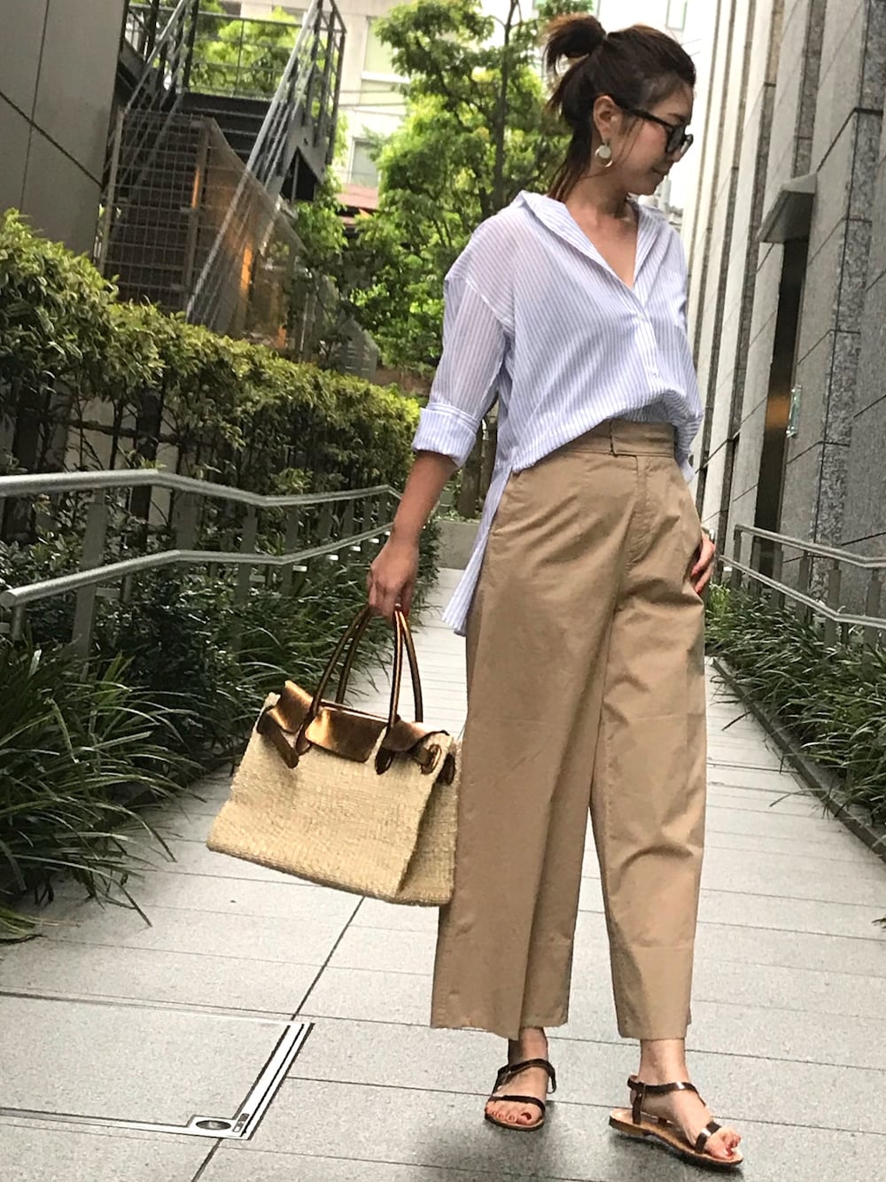 透け感のあるストライプシャツで女らしく。 綺麗なオフィススタイルになりすぎないように ハイウエストのワイドなチノパンとぺたんこサンダルを合わせてオトナカジュアルな印象にまとめました。