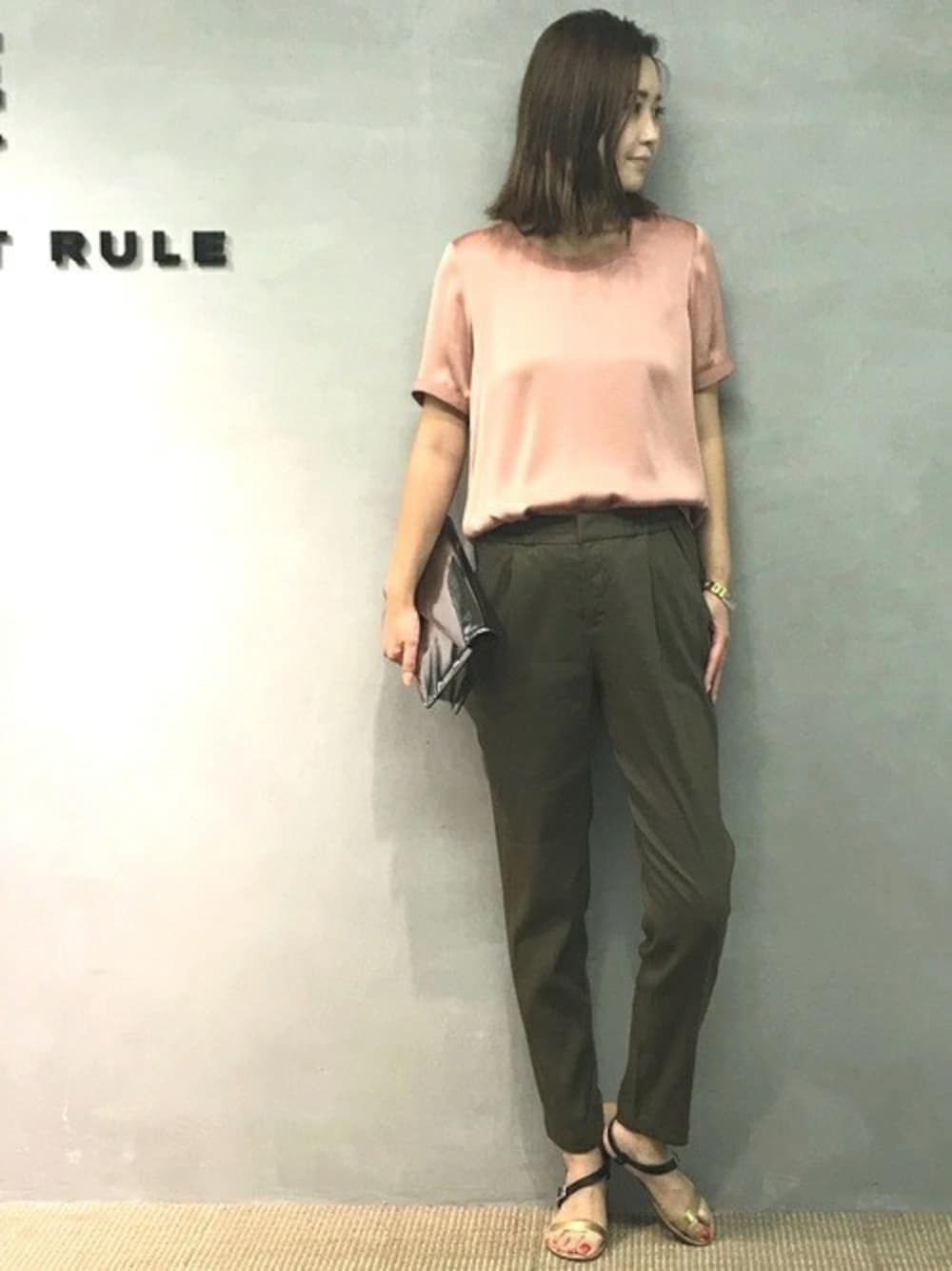 カーキ×ピンクは、甘さとカジュアルの絶妙なバランスがおしゃれに見えます。 シンプルだけどこなれ感ある印象に。