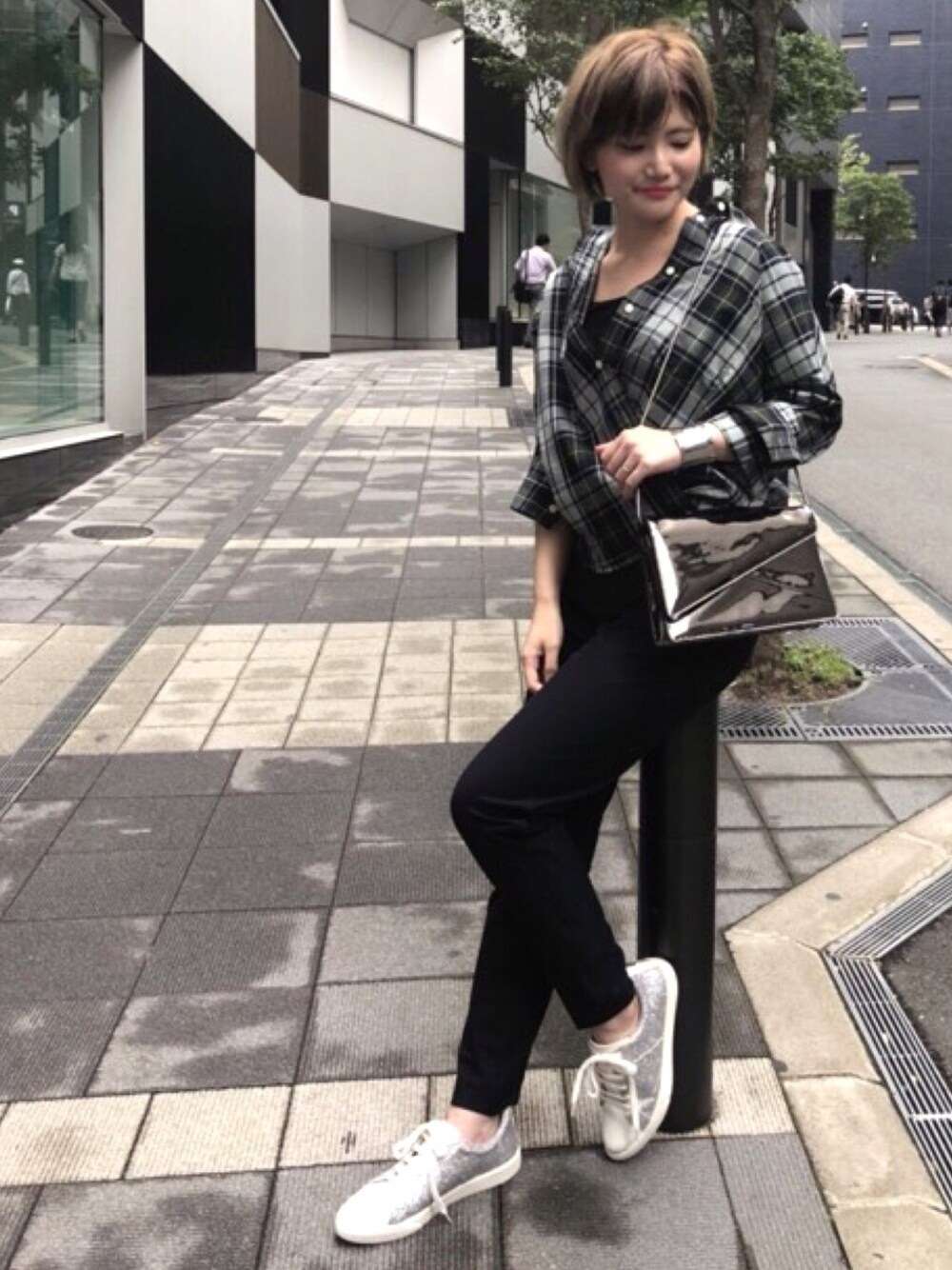 秋を先取りしたカラーのチェックシャツを取り入れたカジュアルなスニーカーコーデ✨ グリッターカラーのスニーカーで、カジュアル過ぎずハンサムで大人っぽい仕上がりに。