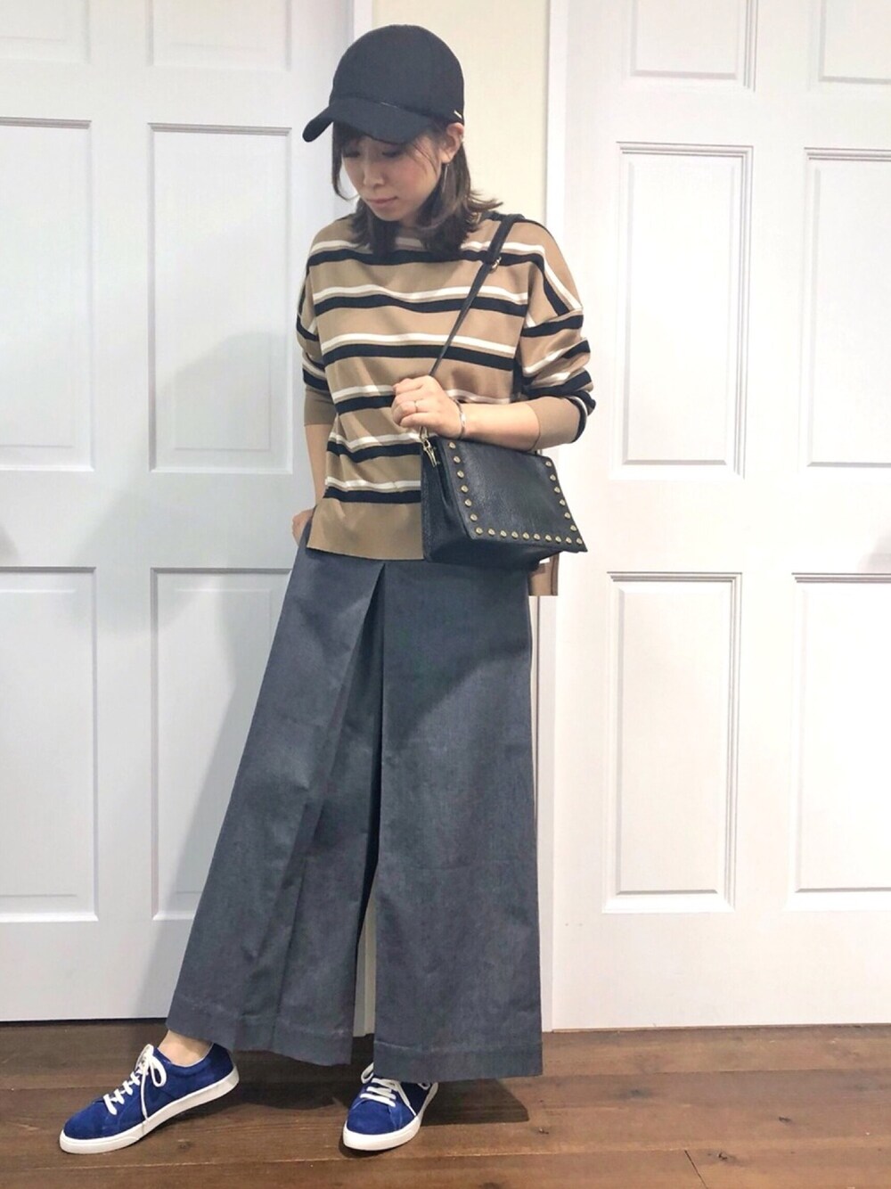 スカート見えするボリュームあるワイドパンツはハンサムな印象に仕上がります✨ 大人カジュアルな雰囲気にしたかったのでキャップ×スニーカーでスポーティーに! 一枚でサマになるボーダートップスはロングシーズン使えそうです。