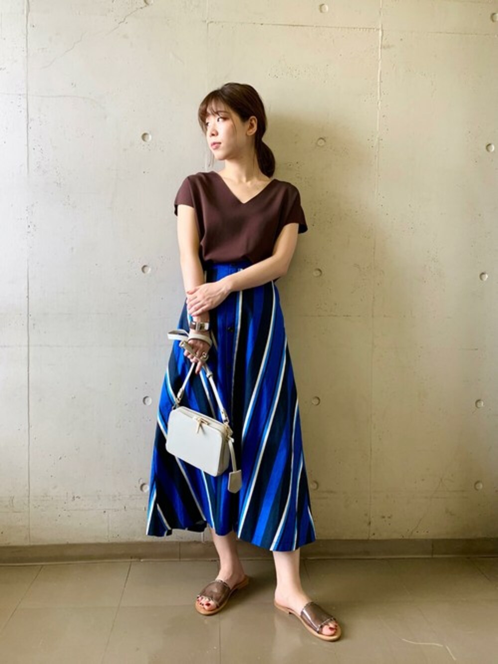 きれいなAラインのシルエットと、大胆なストライプ柄が特徴のスカートに、ブラウンのサマーニットを合わせました。 ドライタッチのニットはなめらかな着心地で、ほど良く開いたVネックが、首元を綺麗に見せてくれます。