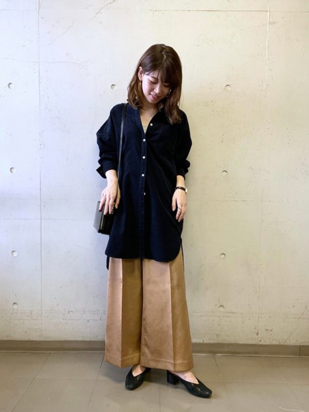 ヴィンテージ風のサテンワイドパンツと、コーデュロイのロングシャツを合わせた、Iラインのコーディネートです。 ゆるく着られて楽ですが、縦長のラインを作ってくれるのでスタイルアップも叶います♪