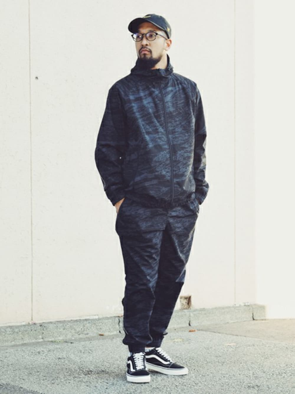 ゴーストライオン カモをプリントしたシャリ感のあるコーデュラ®素材のセットアップ スタイル。 ローカットのスニーカーにアンクルソックスを組み合わせてアクセントに。