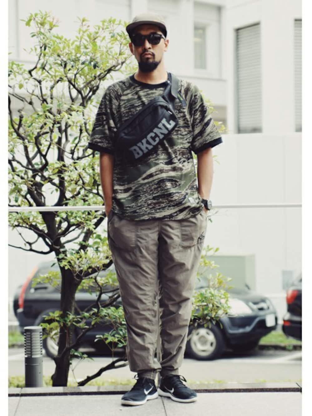 COOLMAX®︎サーマル素材のTシャツに、薄くて軽いナイロン素材のジョガーパンツとジェットキャップを組み合わせ、 アースカラーを基調としつつも、黒い小物やスニーカーでアクセントを付け、機能性も重視したコーディネート。