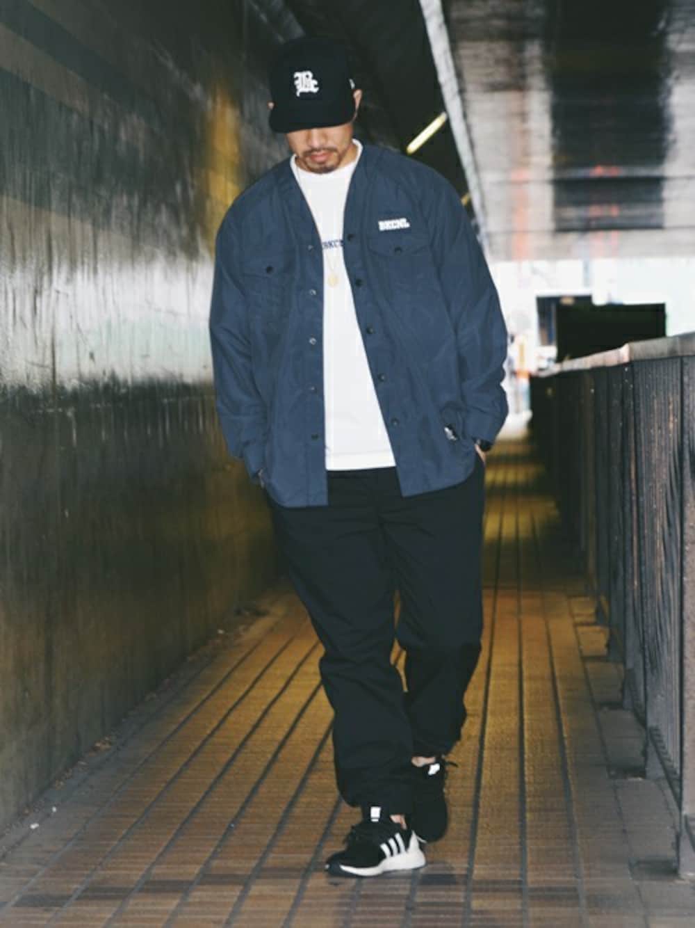 軽量ナイロン素材のスカウトシャツをメインに、シンプルなTシャツとクールマックス素材のジョガーパンツを合わせたストリートスタイル。