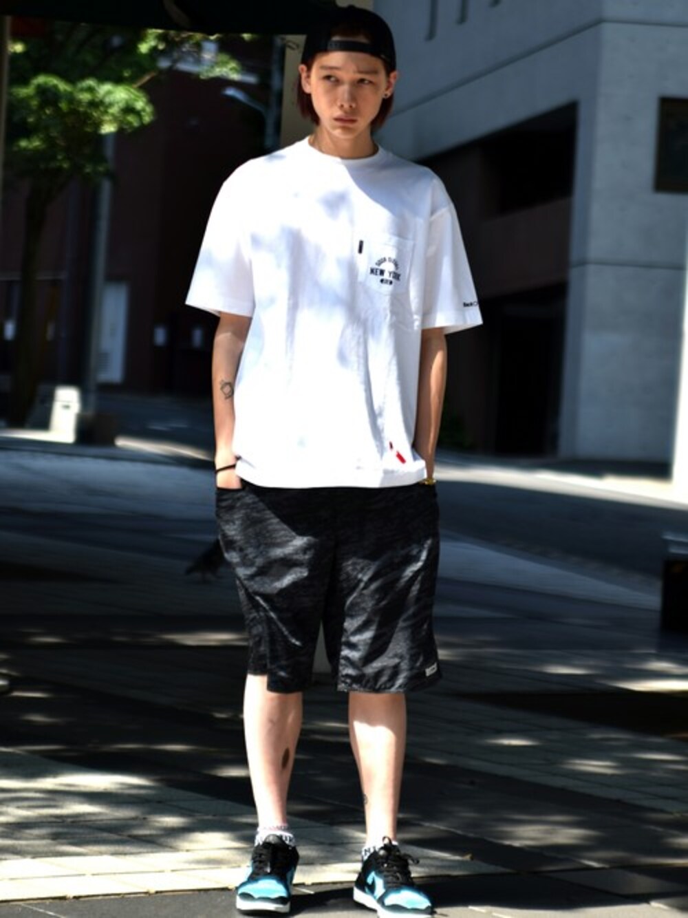 シンプルなポケットTシャツにオリジナルカモ柄のボードショーツを合わせた夏のアウトドア×ストリートのMIXスタイル。