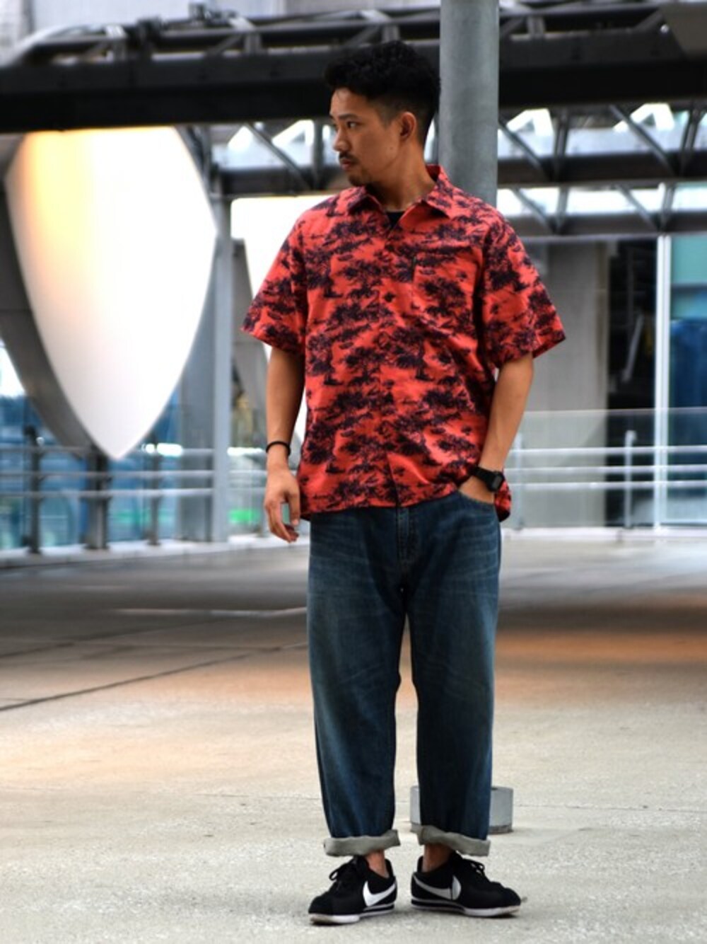 オリジナルテキスタイル【SWAMP】の柄シャツをメインに夏でも活躍してくれる薄手のデニムパンツを合わせた夏のストリートカジュアルスタイル。
